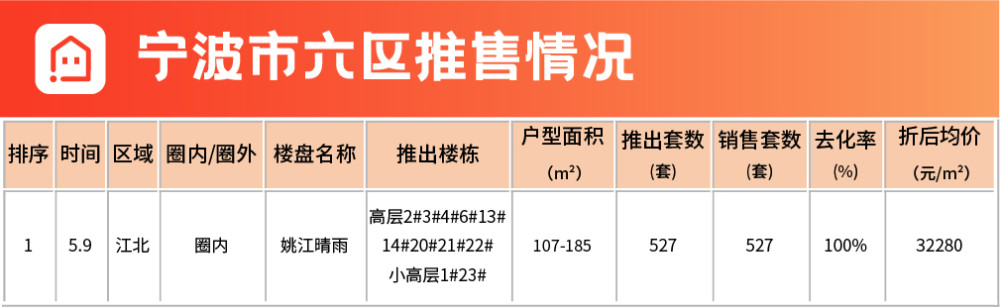 上周僅一個項目加推,為江北的姚江晴雨。項目位于姚江新城板塊,賣點主要以姚江新城地段及未來規(guī)劃,近軌交4號線(洪塘中路站),一線臨江,世外學校教育資源,內部商業(yè)配套,價格倒掛優(yōu)勢為主,去化率100%。