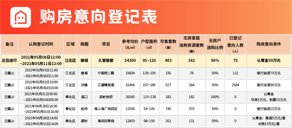 上周,共有6盤確定認籌,除去已于前日(5月9日)開盤的姚江晴雨外,本周還將迎來5個項目入市,但從目前的意向登記人數(shù)來看,堪稱慘淡,其中江北慈城的久譽慈郡和寧宸院二期都是由圈外晉升到圈內的項目,稀缺的房票也讓原先一大批懷抱投資需求的主城區(qū)剛需外溢客戶“有心無力”。