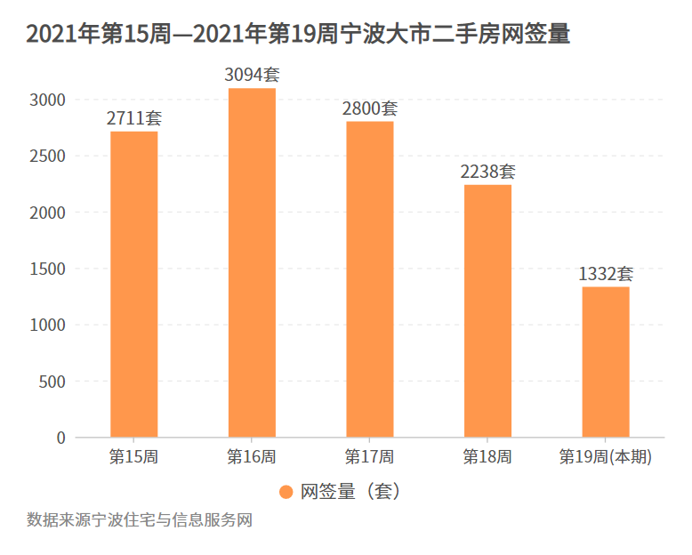 第19周(5.3-5.9),寧波大市共網(wǎng)簽二手房1332套,環(huán)比前一周下跌40.28%。這也是二手房成交量自第17周(新政后)以來第三次下跌,與上上周相比,成交量大幅度回落。其中固然有五一節(jié)日分流的因素,但與去年同時期相比,成交直接比上年19周同期(2279套)少了41.55%,堪稱腰斬。