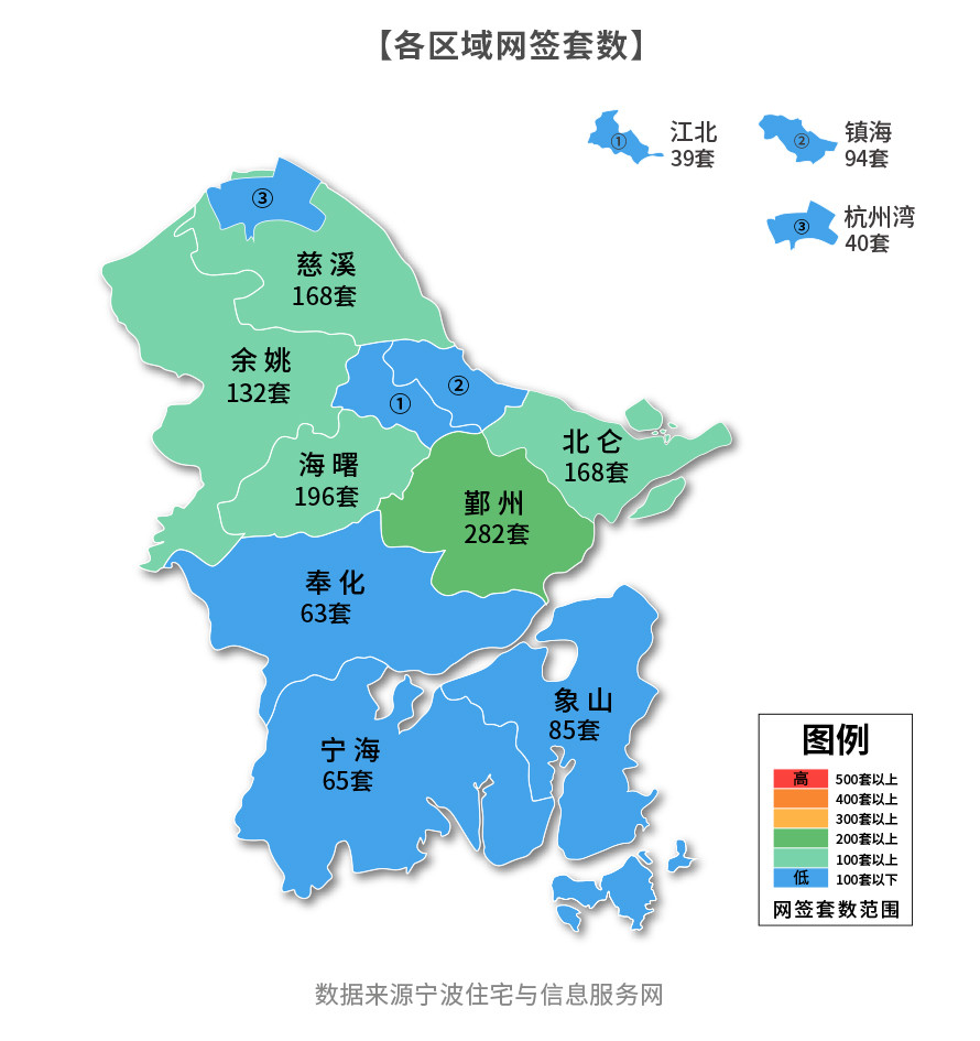 上周市六區(qū)二手房網(wǎng)簽前三區(qū)域分別是鄞州區(qū)、海曙區(qū)、慈溪市,鄞州區(qū)網(wǎng)簽282套,位列網(wǎng)簽榜單之首;海曙區(qū)網(wǎng)簽196套,位居第二;慈溪市網(wǎng)簽168套,位居榜單第三名。