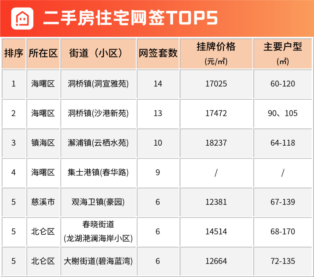熱門成交小區(qū)TOP5中,海曙區(qū)的洞橋鎮(zhèn)(洞宣雅苑),上周成交14套,位居第一,掛牌均價分別為17025元/平;海曙區(qū)的洞橋鎮(zhèn)(沙港新苑)和鎮(zhèn)海區(qū)的澥浦鎮(zhèn)(云棲水苑)則分別位列第二,第三名。